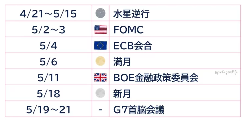 経済イベントとしては欧米の金融政策の会合やG7が並び、会合内容次第で市場が大きく動くこともありそうです。
