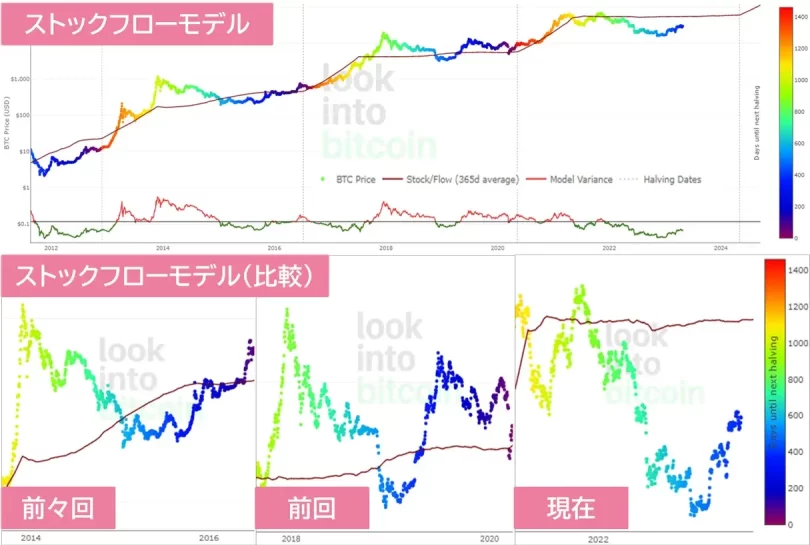 ストックフローモデルでは、半減期まで残り300日前後のタイミングで一旦頂点を付ける傾向があります。