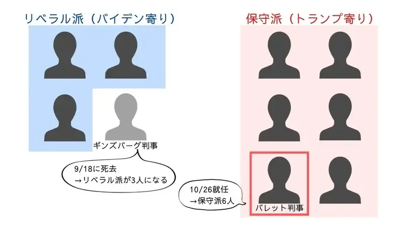 ギンズバーグ判事の死去により、リベラル派が3人になり、新しく就任したのは保守派のバレット判事でした。